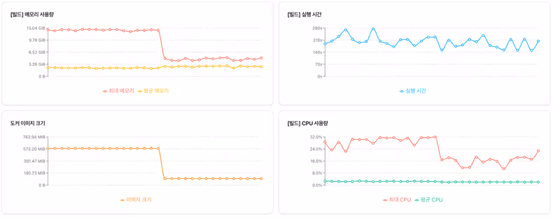 배포 파이프라인에서 의존성 설치 및 빌드 소요 시간, CPU 및 메모리 사용량, 최종 도커 이미지 크기 등을 수집하여 서버에 저장하는 로직을 추가했습니다. 도커 이미지가 빌드되는 환경 자체가 도커인 DinD(Docker-in-Docker) 구조였기 때문에, 정확하게 지표를 측정하기 위해 현재 컨테이너의 cgroup 경로를 동적으로 파악하고 값을 참조하도록 구현했습니다.