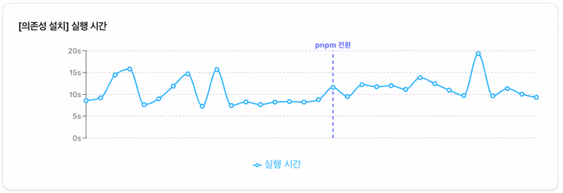 매일 사용하는 익숙한 툴을 변경하는 것은 개발자들에게 적지 않은 피로감을 줄 수 있습니다. 따라서 pnpm으로의 전환이 귀찮은 ‘숙제’가 아니라 ‘기대되는 변화’로 느껴지길 바랐습니다. 개발자를 설득하는 가장 효과적인 방법은 역시 지표가 어떻게 개선되는지를 객관적으로 보여주는 것이라고 판단하여, 전환 전후 성능 수치를 시각화하는 대시보드를 구축하기로 결정했습니다.